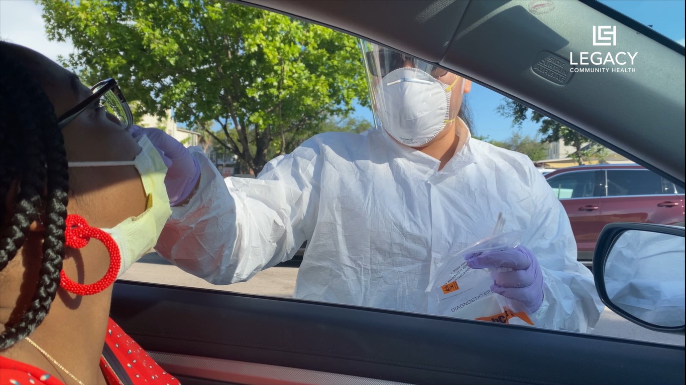 Black female patient is tested for COVID-19 from her vehicle at Legacy Community Health. August 2020.