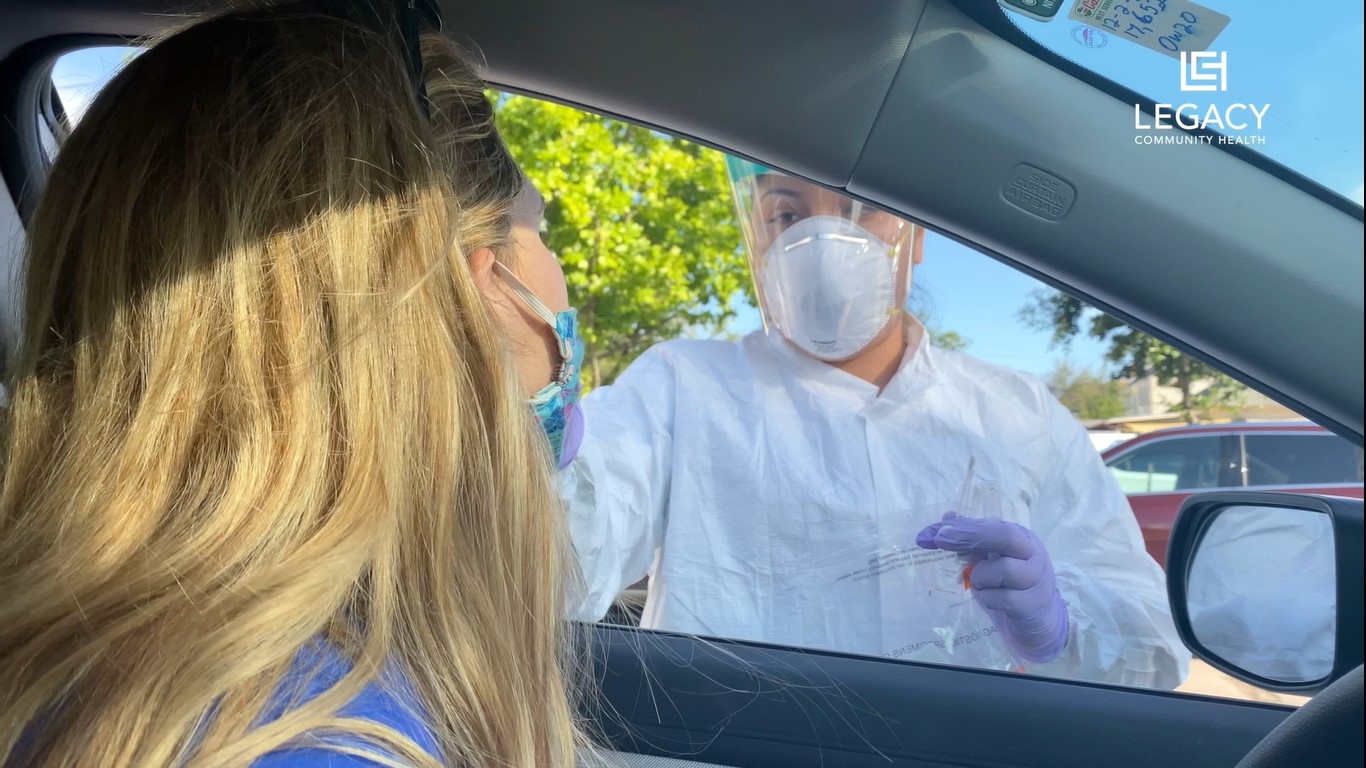 White female patient is tested for COVID-19 from her vehicle at Legacy Community Health. August 2020.